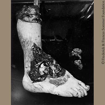The "Amputated Foot" was brought to Sommer by his physician. Doctor Born was an amateur photographer, who had seen Sommer's pictures of chicken parts and promised to, "one day bring something worth photographing." The irrepairable foot was amputated from a young hobo who had fallen asleep while riding the rails near Askfork, Arizona. This photograph has always evoked strong feelings. When first published in Aperture 9:3 1961 under the title "Detail," there were several letters sent to the editor concerning Sommer's subject matter (Aperture 9:4 1961). There is a long history of artists studying and making anatomic studies from Leonardo da Vinci onward and Sommer was honoring this tradition. |