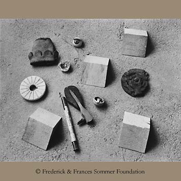 In 1946-47, Frederick Sommer built the first studio addition onto his cabin in Prescott, Arizona. Using the poured concrete slab floor as the background and four triangular trimmings from the studio's shed roof rafters he made this still life arrangement. Also see the Special Insights section here. |