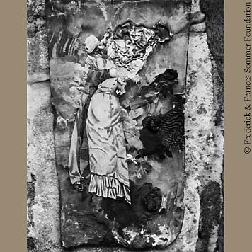 Frederick Sommer assembled his image, "Moon Culmination," using three distinct layers that now appear to fit together seamlessly. The bottom layer is an old piece of wallpaper weathered by wind and rain. The middle layer is a piece of glass a painter had used as a palette and then discarded. The dancers are from an illustration Sommer had previously found and cut down as an exercise to reveal its core condition. |