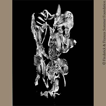 Frederick Sommer often stated, "we must honor gravity on all occasions." The first move in printing a paint on cellophane negative was to locate this negative, which has no traditional camera made borders, in the rectangular world of the printing frame. |