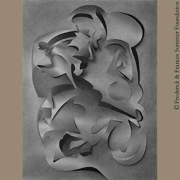 In his own words, Frederick Sommer described making a cut paper, "so I take a big sheet of wrapping paper off a roll and lay it down on the board and very freely, with a knife, make a sensitive looking drawing. This makes a beautiful line, with a flow and precision one would not suspect. I then hang it on a couple of clips and being a well organized guy, as I am at times, I have a camera already standing there. I find myself photographing this sheet which, by then, has become a display of configurations. I usually photograph it in diffused light, but at times I can implement this by adding some side light and give people the notion I am also interested in drama. But in any case, I do it for my own feelings." Quote from, "A talk given at the Art Institute of Chicago, October 1970, revised June 1983," Words/Images, Center for Creative Photography (1984) |
