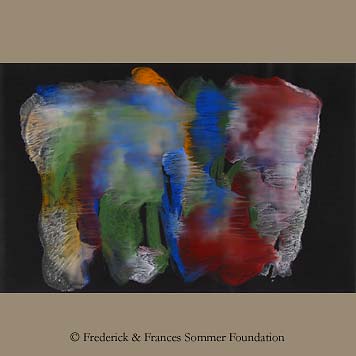 Glue color drawings were made on black paper using (rabbit) hide glue chips melted in hot water and kept warm during use. A variety of raw powdered pigments were stirred into separate containers of the liquid glue and a tiny bit of glycerin was added for elasticity. This particular drawing was smeared using a painter's palette knife. |