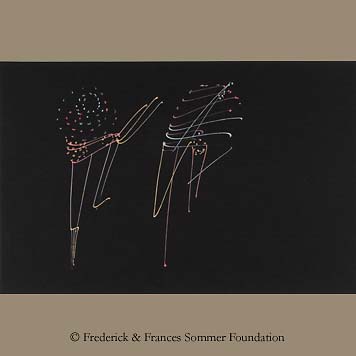 Frederick Sommer enjoyed the cinematic proportions of the 12x18.5 inch sheet of paper and used it consistently from c. 1937-55. Drawings were produced through various means: glue color on black paper, pen and ink or pencil drawings on Strathmore white, pink or blue paper. Sommer occasionally explored a transfer drawing method where color was placed on glass or canvas and a drawing was made on the back of a sheet of paper in contact with the colored surface. Where the pencil pressed the paper, color was transferred. Combining choice and chance, this produced a line of constantly changing color. |
