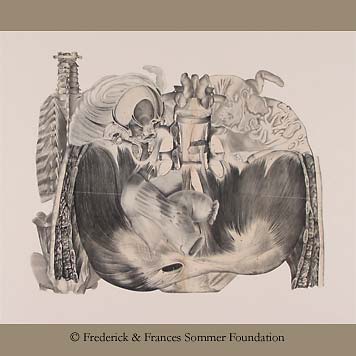 When talking about cooking, Frederick Sommer would stress finding the best ingredients available that day. Once he had started making collages he needed to find old abandoned books with beautiful reproductions. This collage was made from a very large volume on human anatomy, published for medical students and doctors. It contained foldout pages full of sensitive renderings of masterful dissections of the human body. |